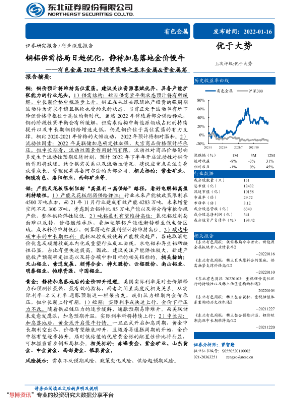 【东北证券】【20220116】有色金属行业2022年投资策略之基本金属&贵金属篇:铜铝供需格局日趋优化,静待加息落地金价慢牛-37页 行业研究