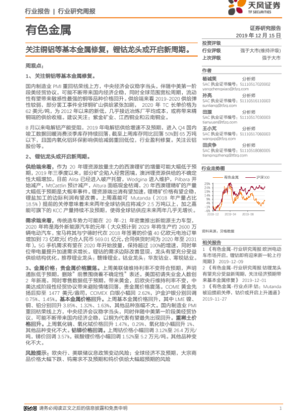 【天风证券】【20191215】20191215-天风证券-有色金属行业研究周报:关注铜铝等基本金属修复,锂钴龙头或开启新周期-15页 行业研究