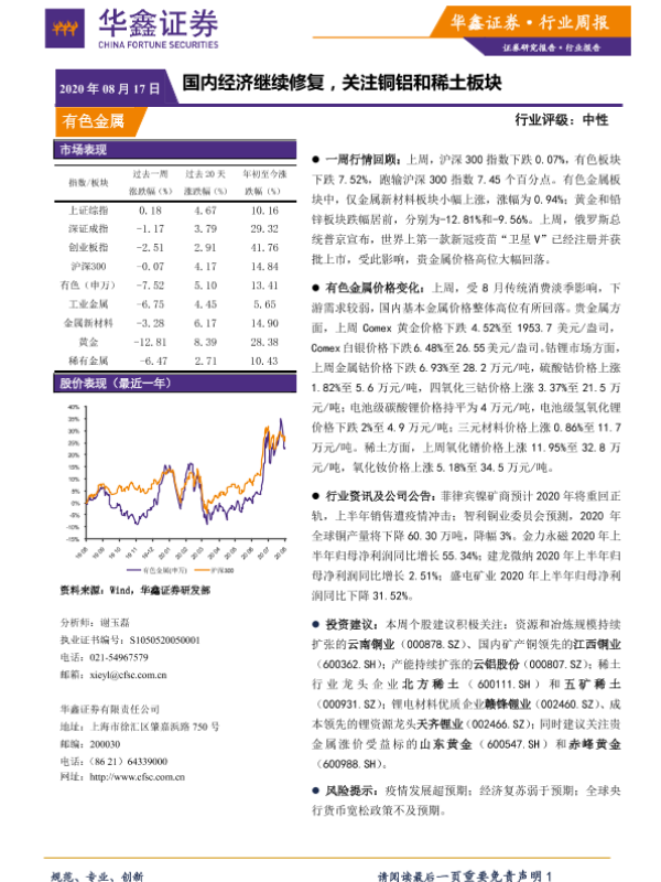 【华鑫证券】【20200817】20200817-华鑫证券-有色金属行业周报:国内经济继续修复,关注铜铝和稀土板块-12页 行业研究