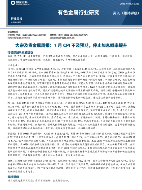 【国金证券】【20230812】20230812-国金证券-大宗及贵金属周报:7月CPI不及预期,停止加息概率提升-13页 行业研究