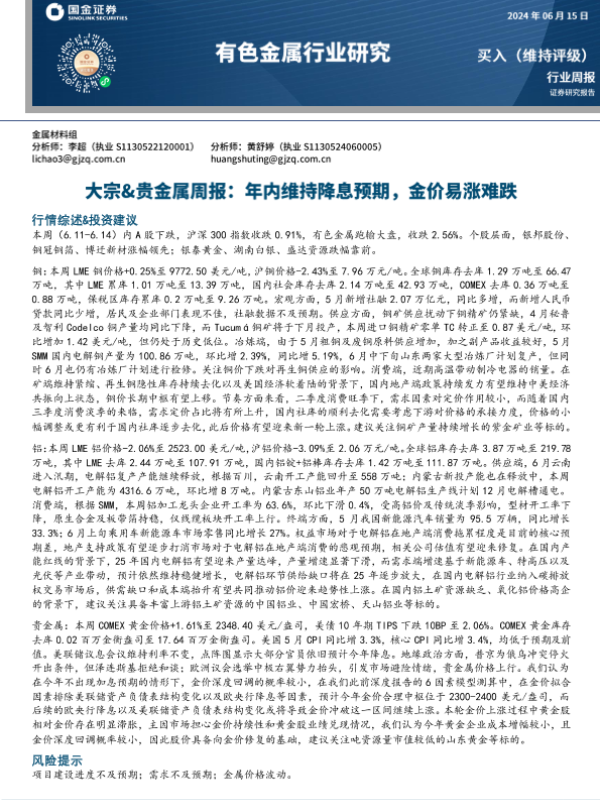 【国金证券】【20240615】20240615-国金证券-大宗&贵金属周报:年内维持降息预期,金价易涨难跌-15页 行业研究