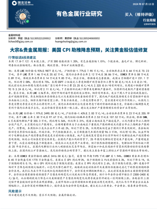 【国金证券】【20240713】20240713-国金证券-有色金属行业大宗&贵金属周报:美国CPI助推降息预期,关注黄金股估值修复-15页 行业研究