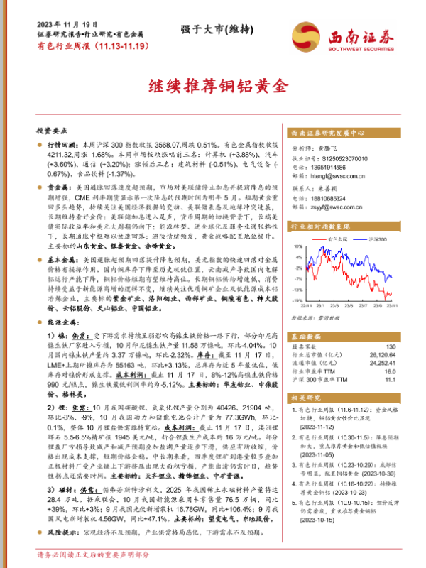 【西南证券】【20231119】20231119-西南证券-有色行业周报:继续推荐铜铝黄金-23页 行业研究