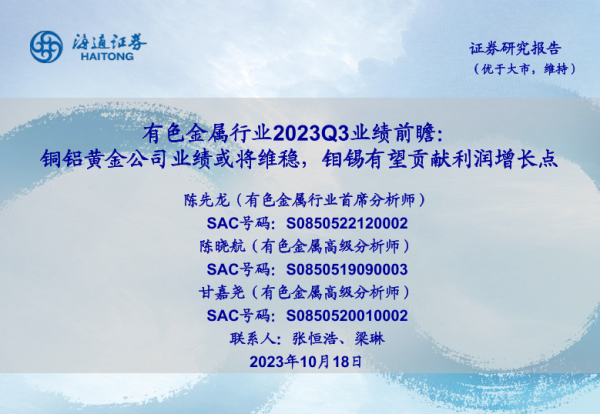 【海通证券】【20231018】有色金属行业2023Q3业绩前瞻:铜铝黄金公司业绩或将维稳,钼锡有望贡献利润增长点-17页 行业研究