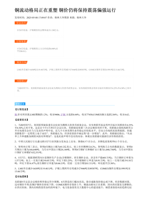 【格林大华期货】【20250508】铜流动格局正在重塑 铜价仍将保持震荡偏强运行-2页 证券期货研究报告