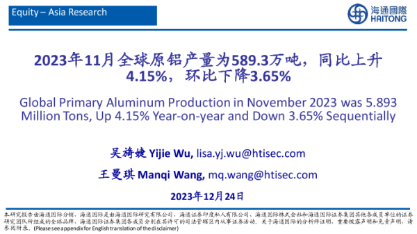 【海通国际】【20231224】有色金属:2023年11月全球原铝产量为589.3万吨,同比上升4.15%,环比下降3.65%-27页 行业研究