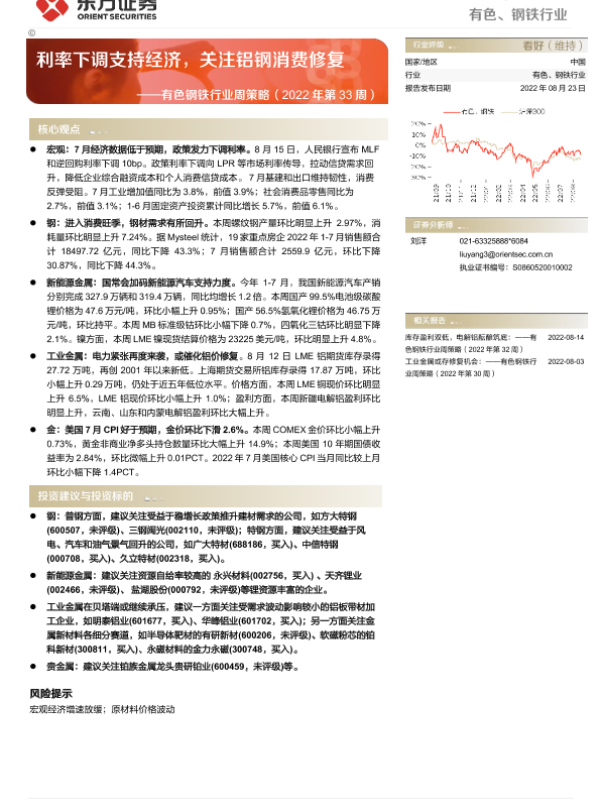 【东方证券】【20220823】有色钢铁行业周策略(2022年第33周):利率下调支持经济,关注铝钢消费修复-37页 行业研究