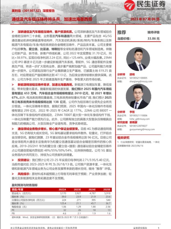 【民生证券】【20230706】美利信(301307)深度报告:通信及汽车铝压铸件排头兵,加速出海墨西哥-47页 行业研究