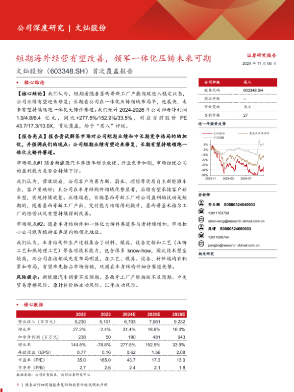 【西部证券】【20241106】文灿股份(603348)首次覆盖报告:短期海外经营有望改善,领军一体化压铸未来可期-33页 行业研究