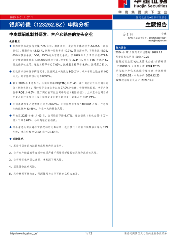 【华金证券】【20250107】银邦转债(123252.SZ)申购分析:中高端铝轧制材研发、生产和销售的龙头企业-12页 行业研究