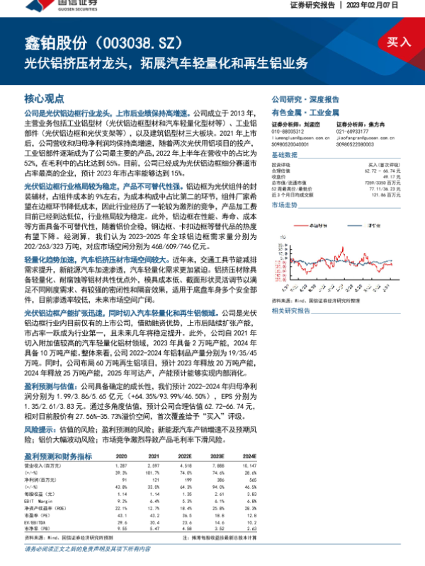 【国信证券】【20230207】20230207-国信证券-鑫铂股份-003038.SZ-光伏铝挤压材龙头,拓展汽车轻量化和再生铝业务-32页 行业研究