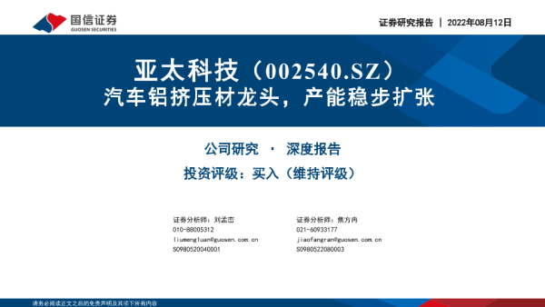 【国信证券】【20220812】20220812-国信证券-亚太科技-002540.SZ-汽车铝挤压材龙头,产能稳步扩张-33页 行业研究