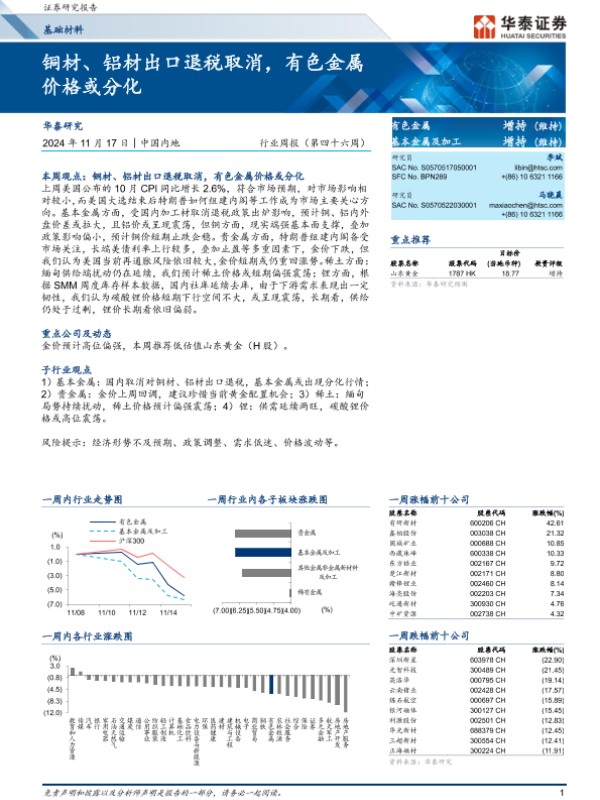 【华泰证券】【20241117】基础材料行业周报(第四十六周):铜材、铝材出口退税取消,有色金属价格或分化-16页 行业研究