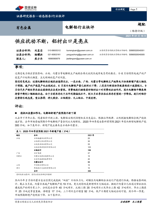 【国信证券】【20210718】有色金属行业:电解铝行业快评:供应扰动不断,铝材出口是亮点-7页 行业研究