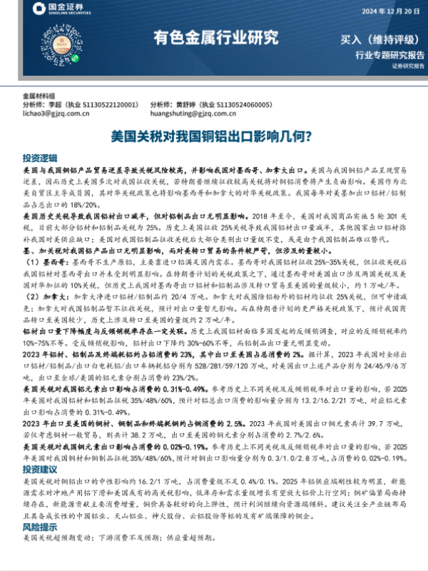 【国金证券】【20241223】美国关税对我国铜铝出口影响几何-39页 行业研究