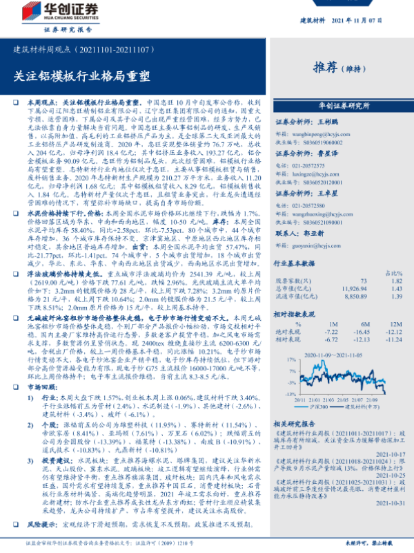 【华创证券】【20211107】建筑材料周观点:关注铝模板行业格局重塑-20页 行业研究
