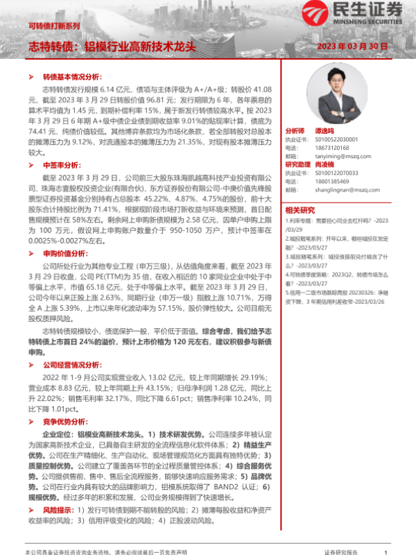 【民生证券】【20230330】可转债打新系列:志特转债,铝模行业高新技术龙头-16页 行业研究