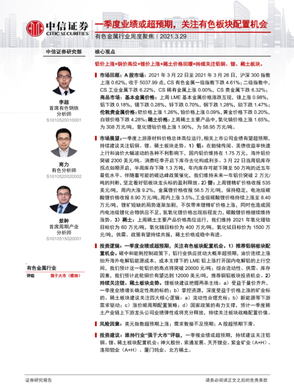 【中信证券】【20210329】20210329-中信证券-有色金属行业周度聚焦:一季度业绩或超预期,关注有色板块配置机会-17页 行业研究