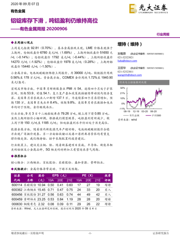 【光大证券】【20200907】20200907-光大证券-有色金属周报:铝锭库存下滑,吨铝盈利仍维持高位-10页 行业研究