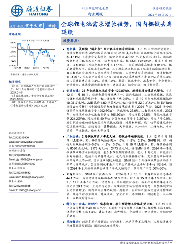 【海通证券】【20240122】20240122-海通证券-有色金属行业周报:全球锂电池需求增长强势,国内铝锭去库延续-14页 行业研究