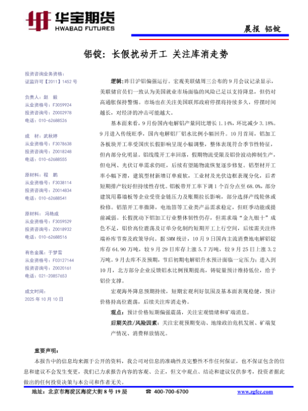 【华宝期货】【202510】铝锭_长假扰动开工_关注库消走势-1页 证券期货研究报告