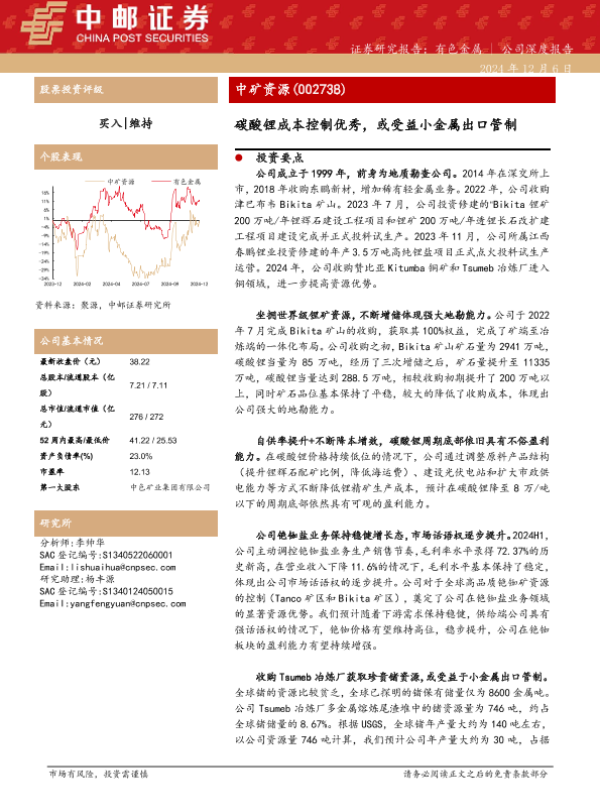 【中邮证券】【20241206】中矿资源-碳酸锂成本控制优秀,或受益小金属出口管制-20页 行业研究