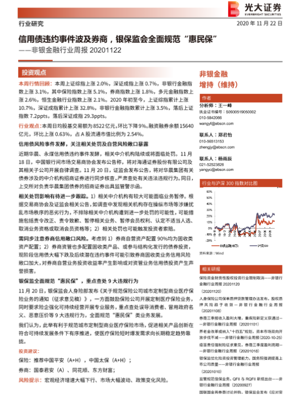 【光大证券】【20201122】非银金融行业周报:信用债违约事件波及券商,银保监会全面规范‘惠民保’-12页 行业研究