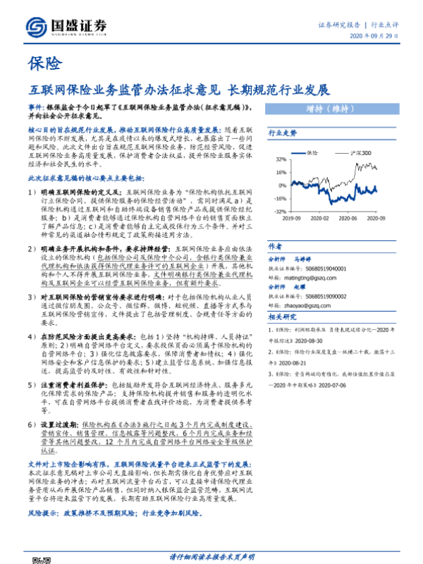 【国盛证券】【20200929】保险行业点评:互联网保险业务监管办法征求意见 长期规范行业发展-2页 行业研究