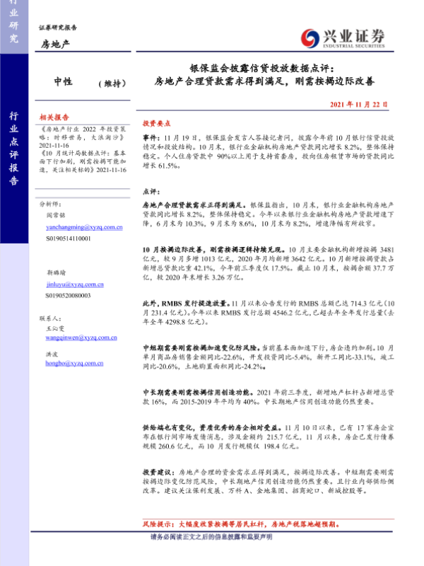 【兴业证券】【20211122】银保监会披露信贷投放数据点评:房地产合理贷款需求得到满足,刚需按揭边际改善-2页 行业研究