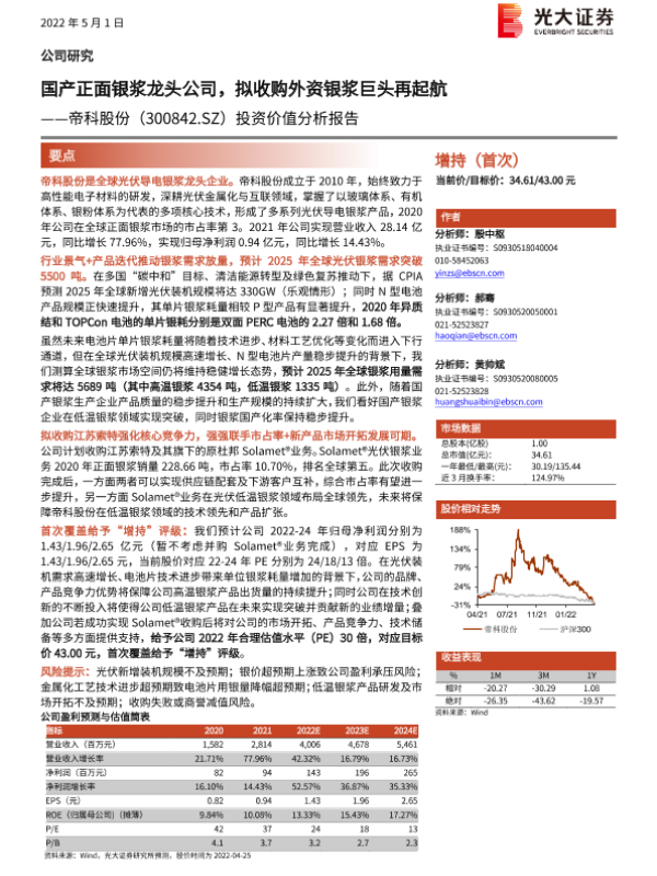 【光大证券】【20220501】国产正面银浆龙头公司,拟收购外资银浆巨头再起航-25页 行业研究