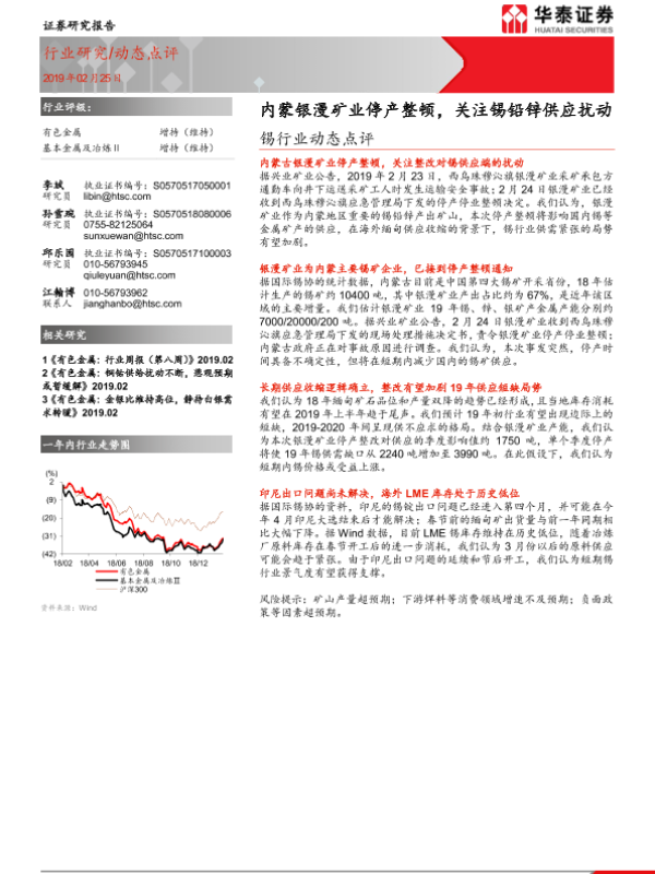 【华泰证券】【20190225】20190225-华泰证券-锡行业动态点评:内蒙银漫矿业停产整顿,关注锡铅锌供应扰动-2页 行业研究