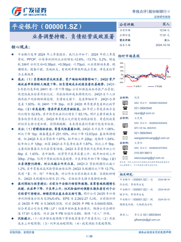 【广发证券】【20241019】平安银行(000001)业务调整持续,负债经营成效显著-23页 行业研究