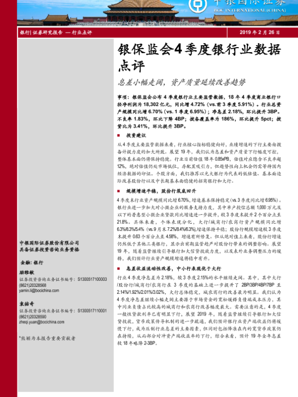 【中银证券】【20190226】银保监会4季度银行业数据点评:息差小幅走阔,资产质量延续改善趋势-6页 行业研究