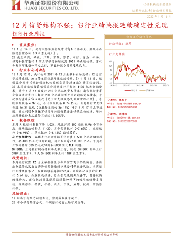 【华西证券】【20220116】12月信贷结构不强;银行业绩快报延续确定性兑现-8页 行业研究
