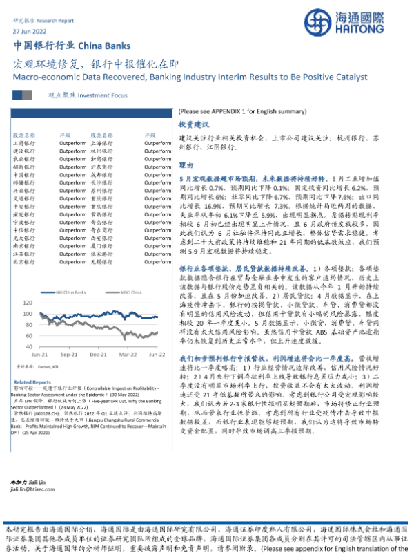 【海通国际】【20220627】宏观环境修复,银行中报催化在即-11页 行业研究