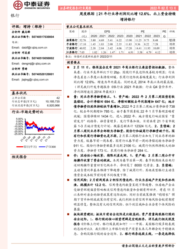 【中泰证券】【20220213】银行周度跟踪:21年行业净利润同比增12.6%,北上资金持续增持银行-18页 行业研究