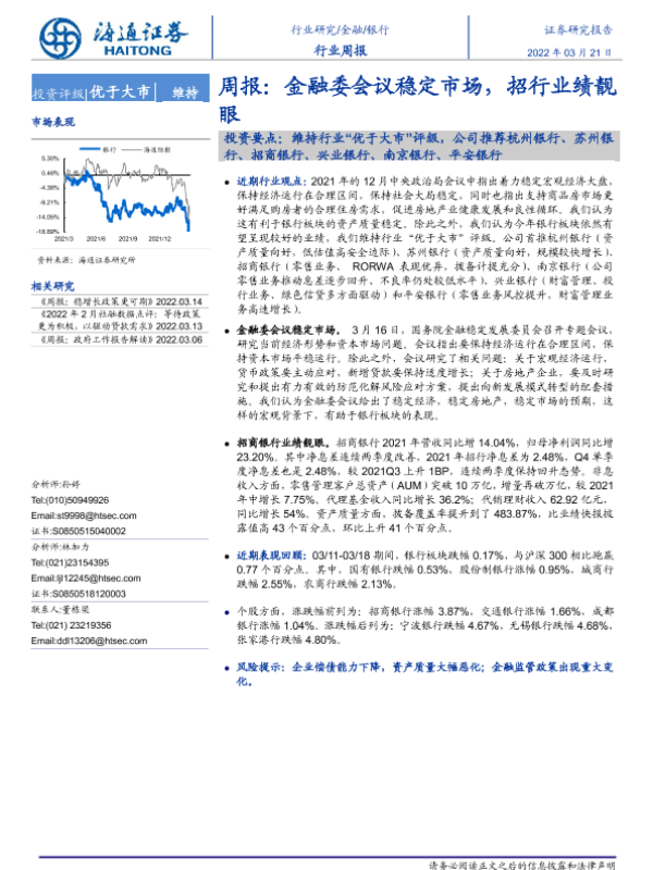 【海通证券】【20220321】银行周报:金融委会议稳定市场,招行业绩靓眼-8页 行业研究