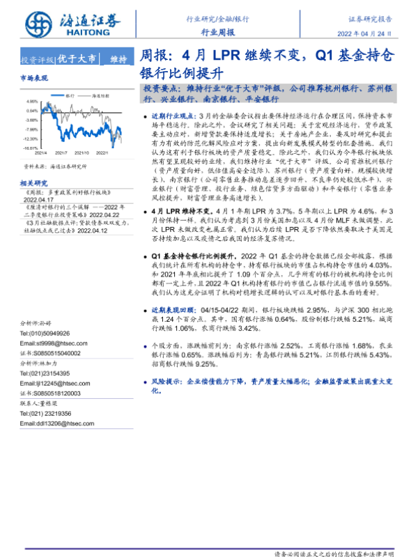 【海通证券】【20220424】4月LPR继续不变,Q1基金持仓银行比例提升-8页 行业研究