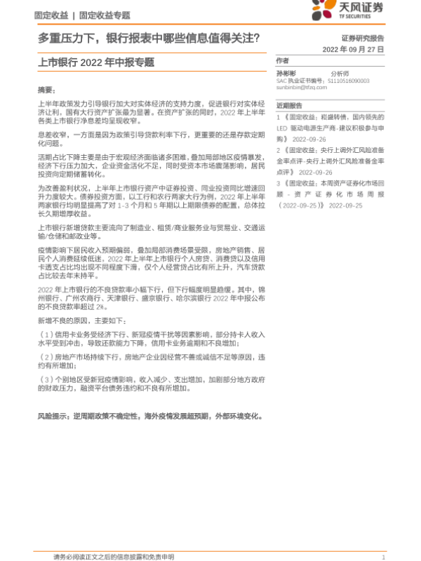 【天风证券】【20220927】上市银行2022年中报专题:多重压力下,银行报表中哪些信息值得关注?-19页 行业研究