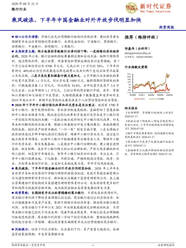 【新时代证券】【20200823】银行行业投资周报:乘风破浪,下半年中国金融业对外开放步伐明显加快-17页 行业研究