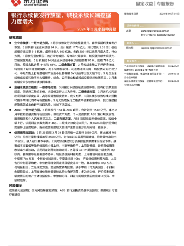 【东方证券】【20240401】2024年3月小品种月报:银行永续债发行放量,城投永续长端挖掘力度增大-23页 行业研究