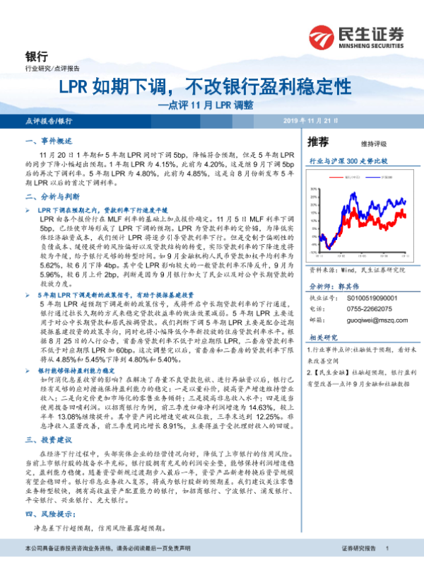 【民生证券】【20191121】11月LPR调整:LPR如期下调,不改银行盈利稳定性-6页 行业研究