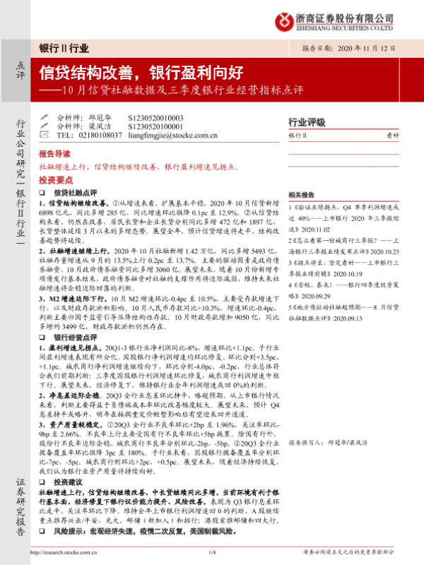 【浙商证券】【20201112】10月信贷社融数据及三季度银行业经营指标点评-4页 行业研究