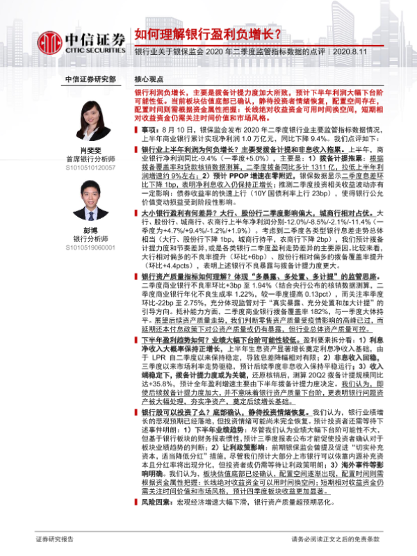 【中信证券】【20200811】银行业关于银保监会2020年二季度监管指标数据的点评-4页 行业研究