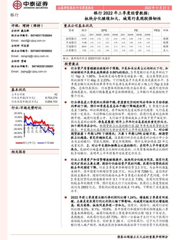 【中泰证券】【20221121】银行2022年三季度经营数据:板块分化继续加大,城商行表现较强韧性-15页 行业研究