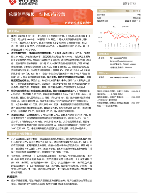 【东方证券】【20220411】3月金融统计数据点评:总量信号积极,结构仍待改善-4页 行业研究