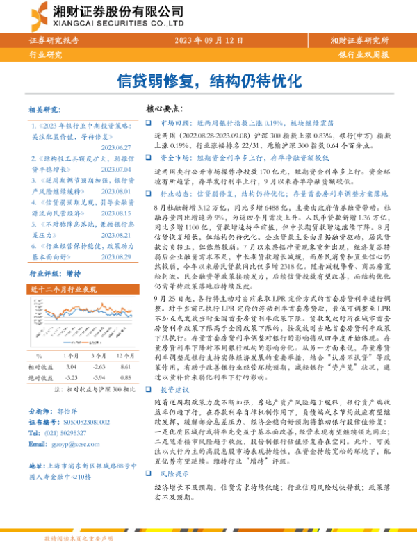 【湘财证券】【20230912】银行业双周报:信贷弱修复,结构仍待优化-11页 行业研究