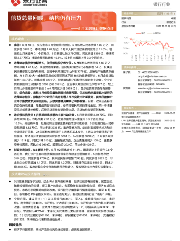 【东方证券】【20220611】银行行业5月金融统计数据点评:信贷总量回暖,结构仍有压力-4页 行业研究