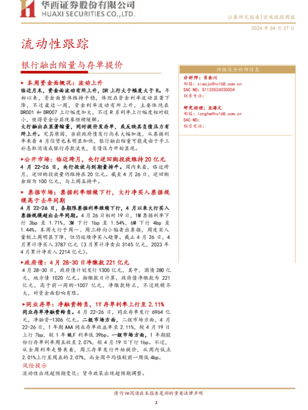 【华西证券】【20240427】流动性跟踪:银行融出缩量与存单提价-21页 行业研究