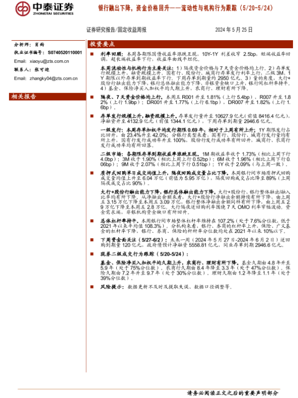 【中泰证券】【20240525】流动性与机构行为跟踪:银行融出下降,资金价格回升-13页 行业研究